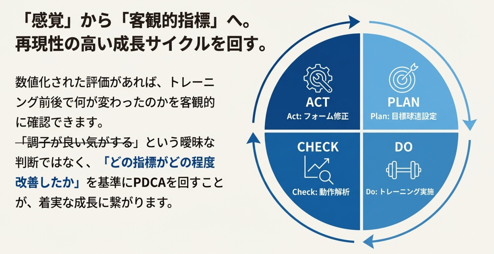 さらに、科学は継続的改善のための指標を提供します。数値化された評価があれば、トレーニング前後で何が変わったのかを客観的に確認できます。感覚が良くなった気がする、調子が上がったように思う、といった曖昧な判断ではなく、「どの指標がどの程度改善したのか」を基準にPDCAを回すことが可能になります。この積み重ねが、再現性の高い成長を生み出します。