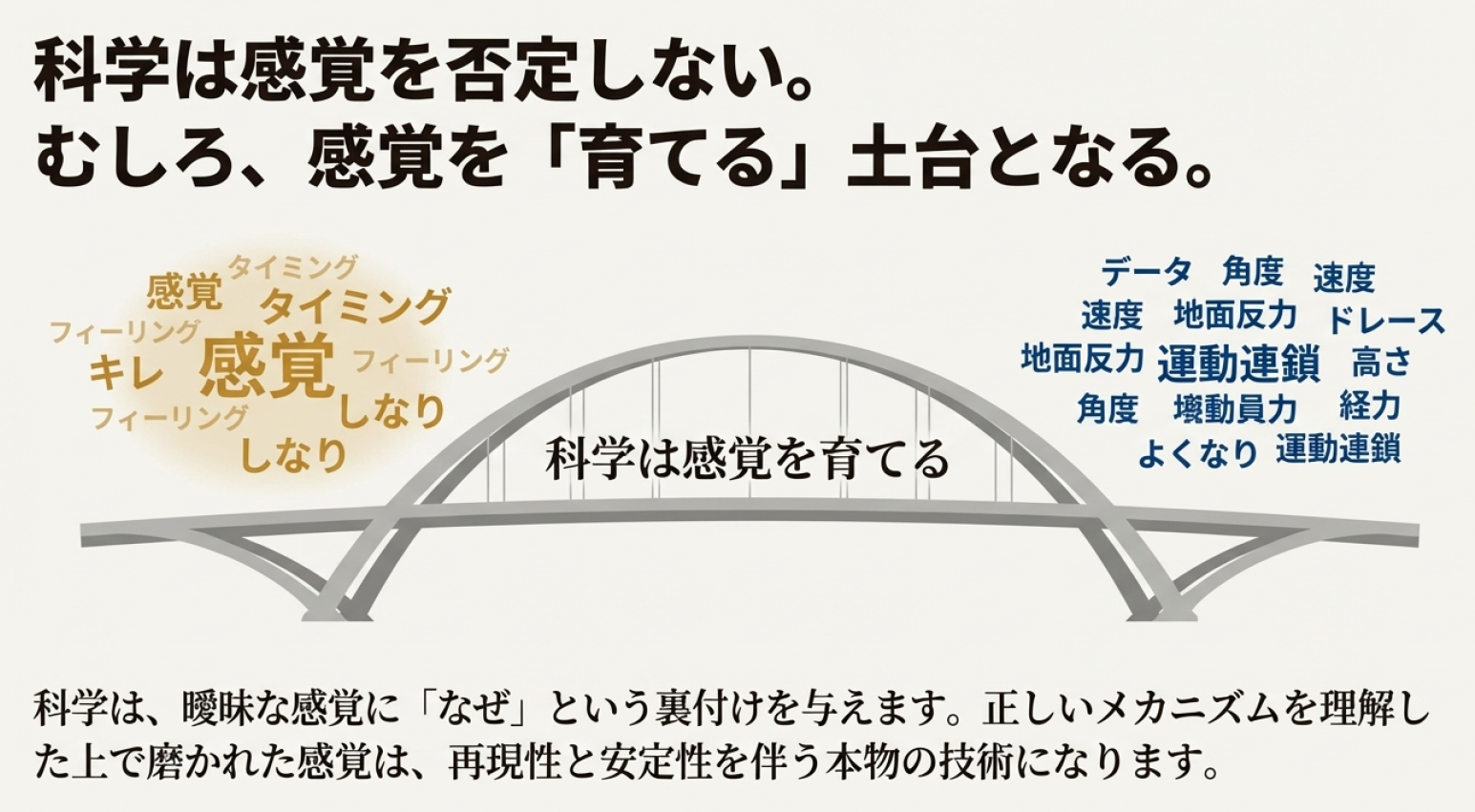 もちろん、野球が数字だけで語れるスポーツではないことも事実です。試合の緊張感、駆け引き、ひらめきといった要素は、今後も人間的な感覚に委ねられる部分でしょう。しかし、だからこそ重要なのは、感覚と科学を対立させないことです。科学は感覚を否定するものではなく、むしろ感覚を「育てる」ための土台となります。正しいメカニズムを理解した上で磨かれた感覚は、再現性と安定性を伴います。