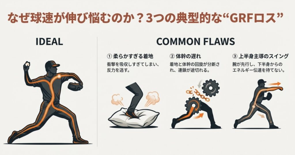 球速停滞の典型例は、①着地が柔らかすぎて反力を逃す、②着地後に体幹が遅れて回旋が分断される、③上半身主導で腕が先行する、の三つです。これらはすべて、地面反力を運動連鎖に変換できていない状態。結果、肩・肘への負担が増え、パフォーマンスも故障リスクも悪化します。