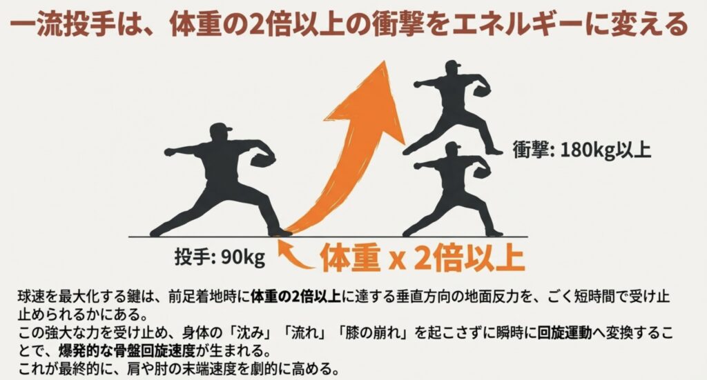 球速は「腕の速さ」で決まる――。そう思われがちですが、近年のバイオメカニクス研究は、その認識を大きく覆しました。実際には、ボールに伝わるエネルギーの源は地面にあり、投球動作の質を左右する最重要因子の一つが**地面反力(Ground Reaction Force:GRF)**です。特に、前足(踏み込み脚)着地時に体重の2倍以上の力を地面から受け取り、それを効率よく上半身へ伝えられるかが、球速の天井を決めると示されています。