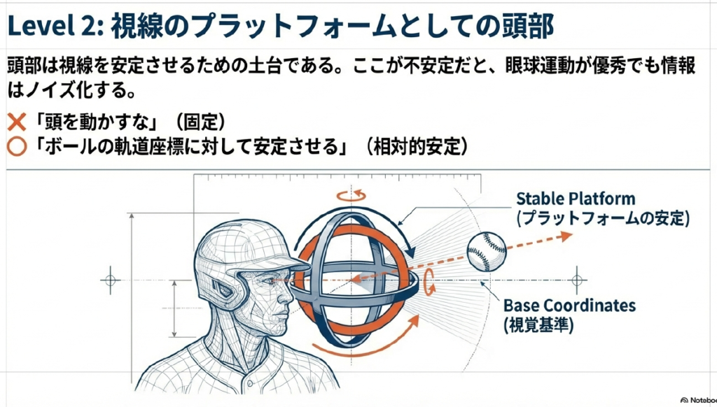 視覚の次に組織化されるのが頭部です。頭部は視線のプラットフォームであり、ここが不安定だと眼球運動がどれほど優秀でも、視覚情報はノイズ化します。打撃で重要なのは「頭を動かすな」ではなく、「頭部がどの座標に対して安定しているか」です。投球に対して頭部が早期に三次元回旋してしまうと、視線の基準が揺れ、予測した到達点と実際の到達点の誤差が増えます。その結果、下半身や体幹が作った時間的余裕が、最後の瞬間に“目の遅れ”として回収されてしまい、バット軌道が早期に修正運動へ移行します。打者が「差し込まれる」「泳ぐ」と言うとき、力学的には回転不足や前脚ブレーキの失敗に見えても、制御学的には“視覚基準の不安定化”が先に起きていることが少なくありません。