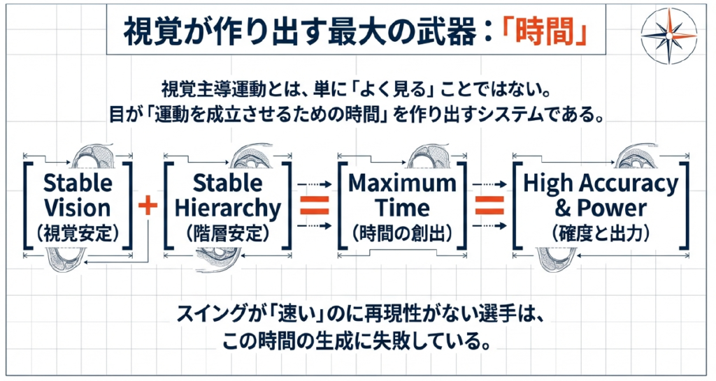 視覚主導運動とは、目で見た世界を基準に身体を動かすというより、目が“運動を成立させるための時間”を作り、その時間の中で頭部と体幹が安定し、四肢が最小限の修正で最大限の出力を出せるように組織化する仕組みです。打撃の上達を、フォームの模倣から一段引き上げる鍵はここにあります。視線が整うと、動きが整い、動きが整うと、力は勝手に立ち上がる。視覚は、打撃の最上流にある技術であり、最も見落とされやすいパフォーマンス要因なのです。