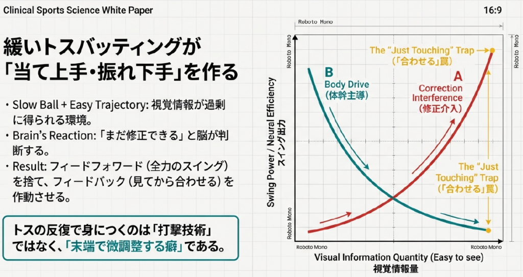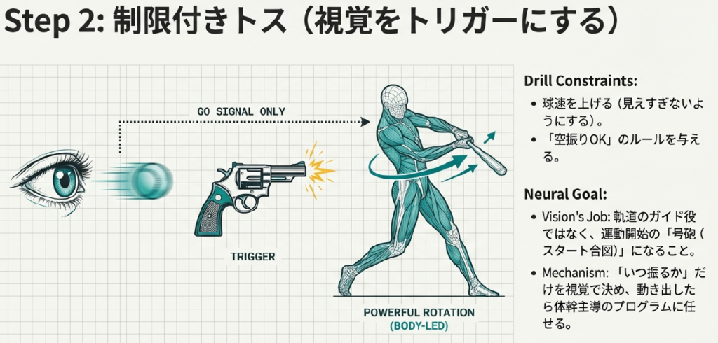 次に行うべきは、制限付きトスです。ここでの狙いは、視覚を「トリガー」にすることです。球速を上げ、球数を絞り、外してもよいというルールを与えます。球数を減らすのは、成功体験を減らすためではありません。運動学習の観点では、反復数が多いほど良いとは限らず、誤差の性質と注意資源の割り当てが学習内容を決めます。球数が増えると、人は当てるための最適化に入りやすく、視覚が修正に介入し、末端主導が再強化されます。逆に少数の高品質な試行は、「開始合図としての視覚」と「再生としてのスイング」を分離しやすい。これは最新の海外研究で議論される、注意の外在化や自己組織化を促す練習設計とも整合します。視覚はボールを追いかけて答えを作るのではなく、振る決断を下すために使われ、決断後はプログラムを実行するだけ、という状態を目指します。