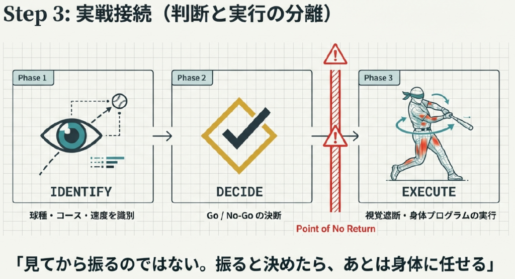 最後に実戦への接続で最も大事なのは、視覚の最終任務を「当てる」ではなく「判断」に固定することです。実戦の視覚は、球種・コース・速度を識別し、振るか振らないかを決めるためにあります。振ると決めた後に視覚が介入してしまうと、スイング中の時間構造が崩れます。多くのトップ打者が口にする「見てから振るのではなく、振ると決めたら任せる」という感覚は、この神経学的分離のことを指しています。置きティーで作ったのは、まさに“任せられる運動プログラム”です。だからこそ転写の鍵は、視覚を段階的に返しつつ、決して「当て係」に戻さないことにあります。