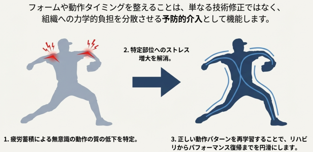 疲労や違和感が蓄積した状態では、無意識のうちに動作の質が低下し、特定部位へのストレスが増大します。そのため、ケアセッションでは動作の再評価と微調整も重要な役割を担います。フォームや動作タイミングを整えることは、単なる技術修正ではなく、組織への力学的負担を分散させる予防的介入として機能します。正しい動作パターンを再学習することで、リハビリからパフォーマンス復帰への橋渡しが可能となります。