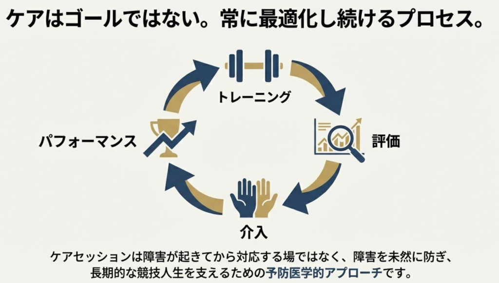このように、ケアセッションは障害が起きてから対応する場ではなく、障害を未然に防ぎ、長期的な競技人生を支えるための予防医学的アプローチです。トレーニング、動作解析と密接に連携しながら、身体の状態を常に最適化し続けることが、真のコンディショニングにつながります。科学的根拠に基づいた評価と介入、個別性を尊重した判断、そして選手との継続的な対話こそが、質の高いケアセッションを成立させる本質と言えるでしょう。